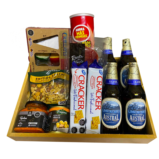 Bandeja de madera con: 4 cervezas artesanales, tabla de quesos, frutos secos, salsa para untar, aceitunas, galletas cracker, jamón serrano, papas pringles,