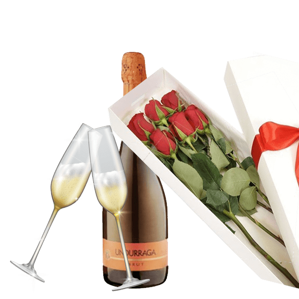 Hermosa caja con 6 rosas importadas más dos copas y una botella de espumante undurraga.