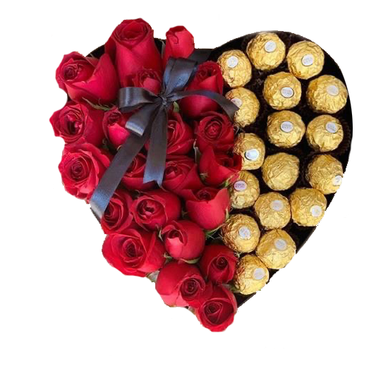 Delicada caja corazón en variedad de colores con 24 rosas importadas y 24 bombones ferrero rocher más cinta decorativa.