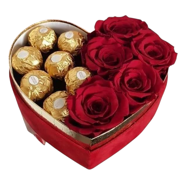 Caja corazón con 6 Rosas Importadas y 8 Bombones Ferrero Rocher