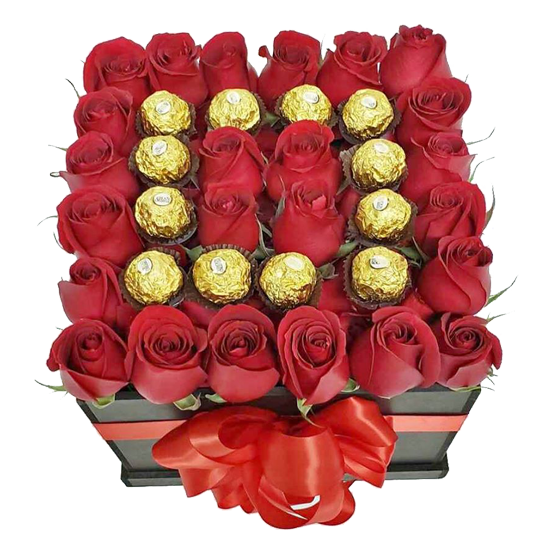 Delicada caja cuadrada en variedad de colores con 24 rosas importadas, 12 bombones ferrero rocher más cinta decorativa.