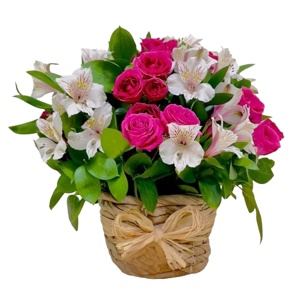 Hermoso canasto de mimbre (en color natural) con 12 rosas importadas y astromelias en color blanco.