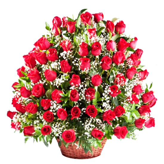 Hermoso canasto de mimbre (color natural) con 70 Rosas Importadas y gypsu.