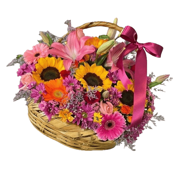 Hermoso canasto primaveral con 15 varas de flores de temporada.