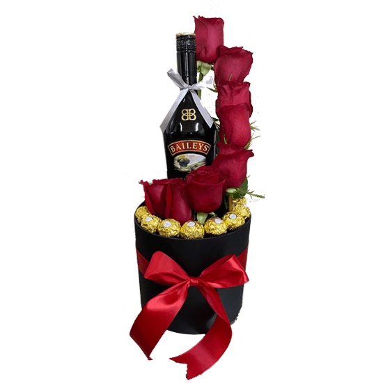 Hermosa caja cilíndrica con 8 rosas importadas, 8 bombones ferrero rocher y Baileys