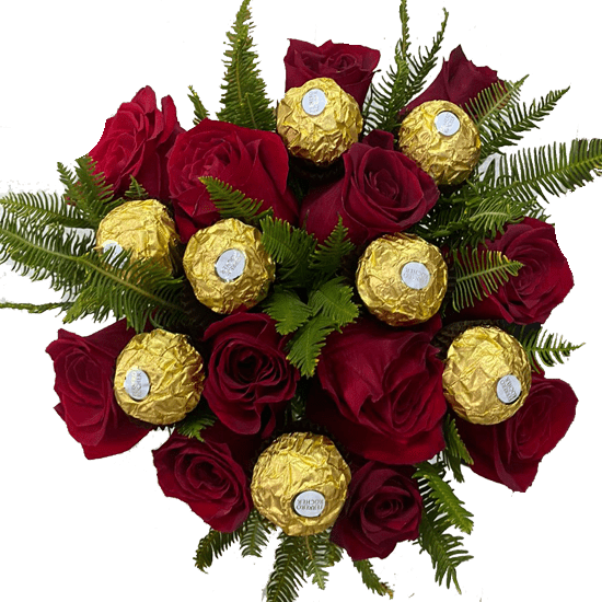 Hermoso ramo con 12 rosas importadas y 8 bombones ferrero rocher envueltas en papel y cinta.