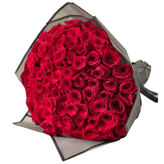 Hermoso ramo con 150 rosas importadas envueltas en papel y cinta.