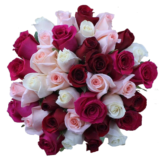 Hermoso ramo envuelto en papel y cinta con 24 rosas importadas en colores rojo, blanco rosado y fucsia.