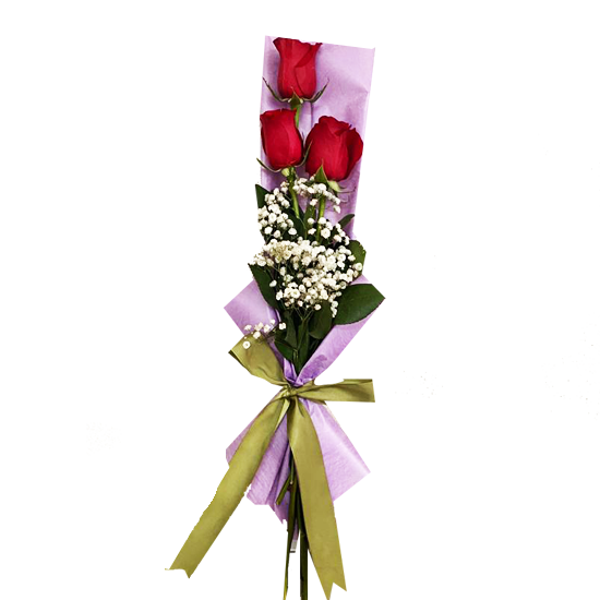 Hermoso y delicado ramo con 3 rosas importadas envueltas en papel y cinta.