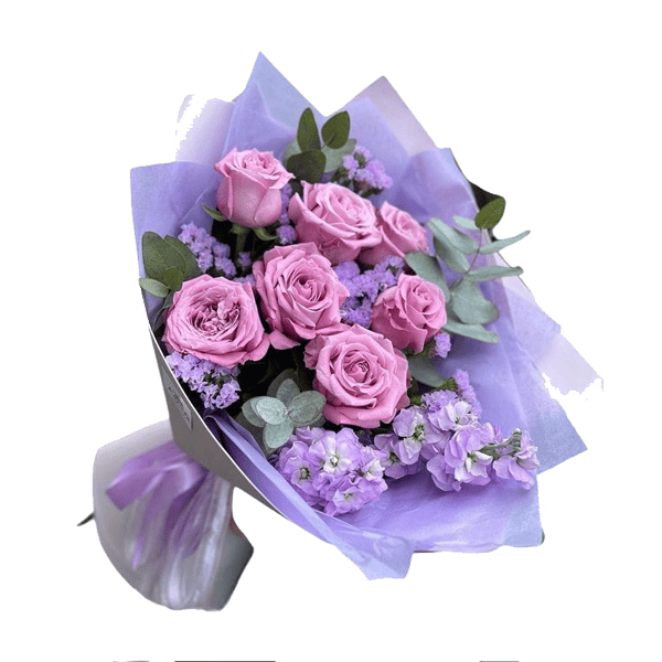 Hermoso ramo con 6 rosas en color lila envueltas en papel y cinta.