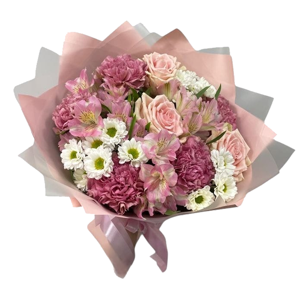 Hermoso ramo con 6 rosas, mini claveles, astromelias y margaritas en tonos pasteles envueltas en papel y cinta