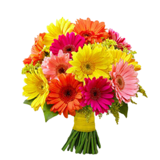 Delicado ramo con 20 gerberas multicolor envueltas en papel floral y cinta decorativa.
