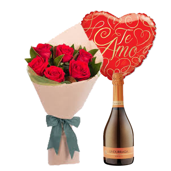 Hermoso dueto La Toscana la cual incluye: un ramo de 6 rosas importadas más cinta y espumante undurraga de 750cc más globo de 18″.