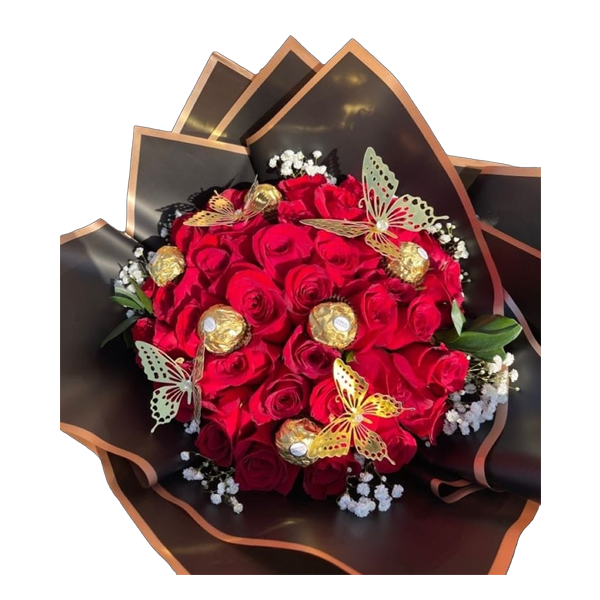 Hermoso ramo luxury con 24 rosas importadas, 8 bombones ferrero rocher incrustados más 4 mariposas.