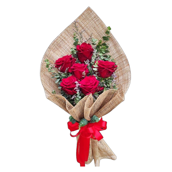 Hermoso ramo con 6 rosas importadas, envueltas en arpillera.